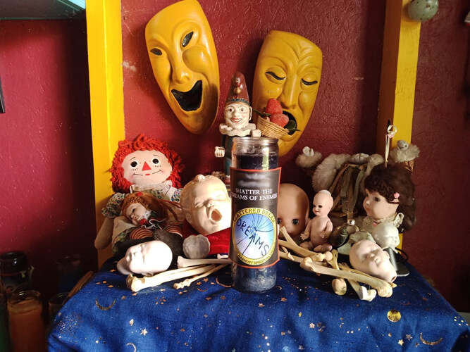 The Altar of Broken Dreams is a section of Divine Harmony Spiritual Church that is devoted solely to Jinx work. The altar is home to a large collection of children's dolls - each one with a grim backstory. Over the course of a lifetime, Reverend Saint Germain has collected these dolls from broken families, tragic deaths, cursed or jinxed households, found in haunted buildings, destroyed in catastrophic acts of nature, one from a family who begged the Reverend to take it off their hands. Some were privy to the last words of dying individuals. These dolls have witnessed the worst of mankind's misfortunes and depravities and, when properly enticed, will pass them on to the target of your anger.