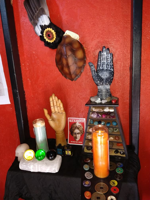 The Altar of 50 Skulls is a section of Divine Harmony Spiritual Church that is devoted solely to Headwork. Headwork is a powerful form of hoodoo that can be used to make the target think or dream about someone or something, to insert subliminal messages in one's head, to make the target believe or deny certain thoughts, or to uncross and heal the mind of anyone suffering from emotional agony, dark dreams, love spells, or any form of mind control. The skulls represent ancestors who will be called forth to intercede on the caster's behalf. Adding power to the altar is a timber from the original Missionary Independent Spiritual Church. Two large quartz crystals amplify the energies even more - making ceremonies done on this altar particularly powerful!
