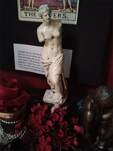 The Garden of Venus is a section of the main chapel that is dedicated for work attracting lovers, soothing problems in relationships, rekindling passion in relationships that have gone cold, and for reconciliation. This altar calls upon the Goddess Venus to bring her influence into matters of love, beauty, desire, sex, fertility, friendship, sympathy, self-love, increased excellence in artistry, establishing healthy plants, and increasing aesthetic beauty.