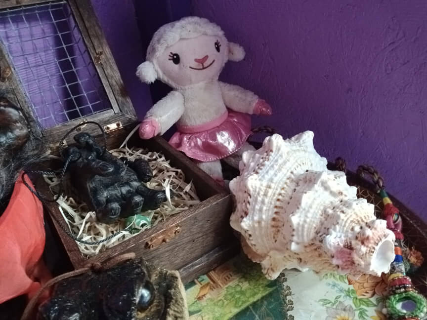This ceremony makes use of of several curious relics and totems to call forth the combined power of beast and man. The shrine contains an antique monkey's paw which was said to grant wishes, a strange clawed hand found in Tibet which has been speculated to be from a warewolf or a yeti, the head of an aligator named Bill, an enchanted conch shell which is blown during the ceremony, and a doll once belonging to a child who grew up to be a civil rights activist; representing the primal human drive to fight against injustice. This altar can serve various ceremonies for a range of outcomes, everything from granting your heart's desire to bringing the swift hand of retribution down upon wrongdoers.